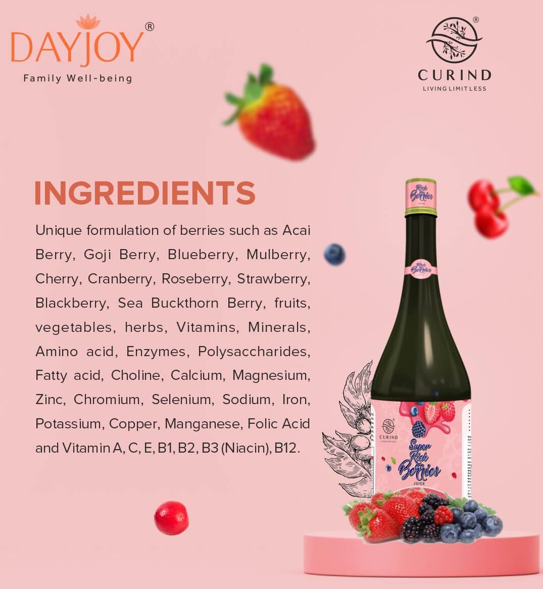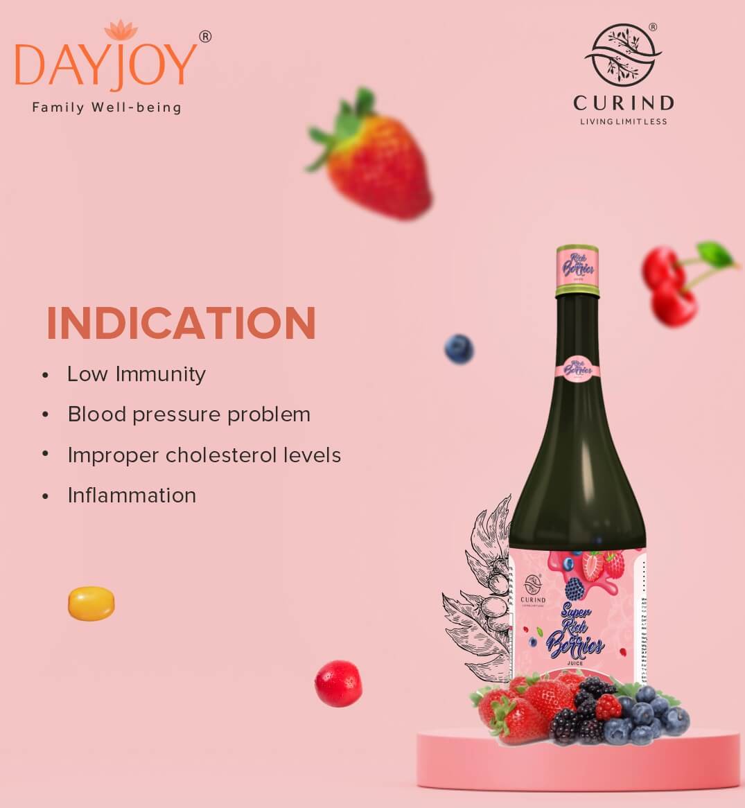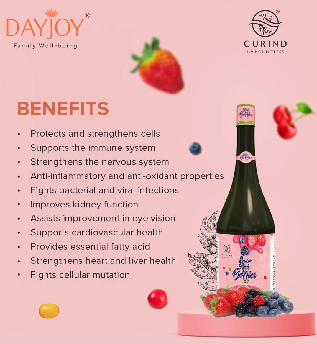 Curind’s Super Rich Berry Juice is a nutrient-packed beverage made from a blend of antioxidant-rich berries, designed to support overall health and well-being. High in Vitamin C, this juice strengthens the immune system, promotes radiant skin, and helps combat oxidative stress. With its powerful antioxidants, it aids in detoxification, supports heart health, and reduces inflammation. Regular consumption of Super Rich Berry Juice provides a natural energy boost, improves digestion, and enhances overall vitality, making it an excellent addition to a healthy lifestyle.